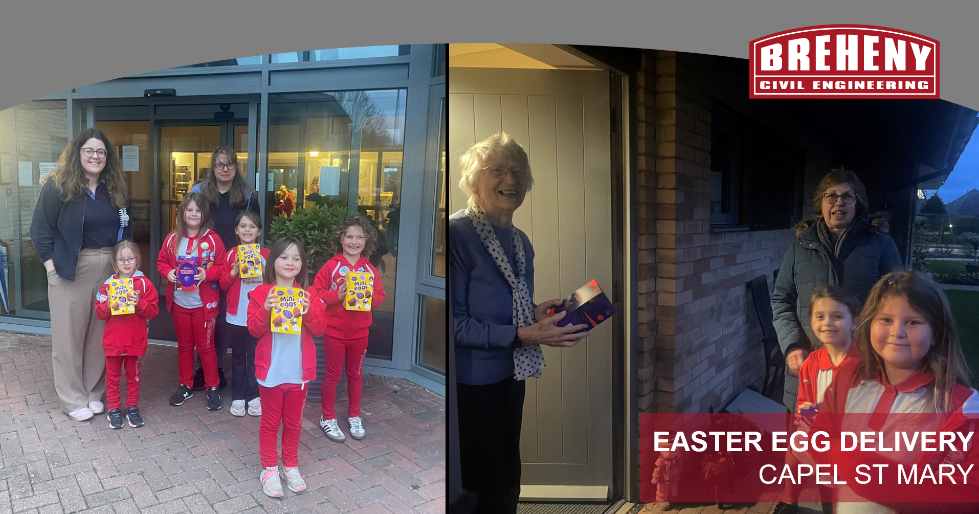 Breheny Civil Engineering proudly donated and delivered 50 Easter eggs to the residents of Dove Close Retirement Complex in Capel St Mary, Suffolk. These were then distributed by the local Rainbow group, helping the girls work towards their charity badge.